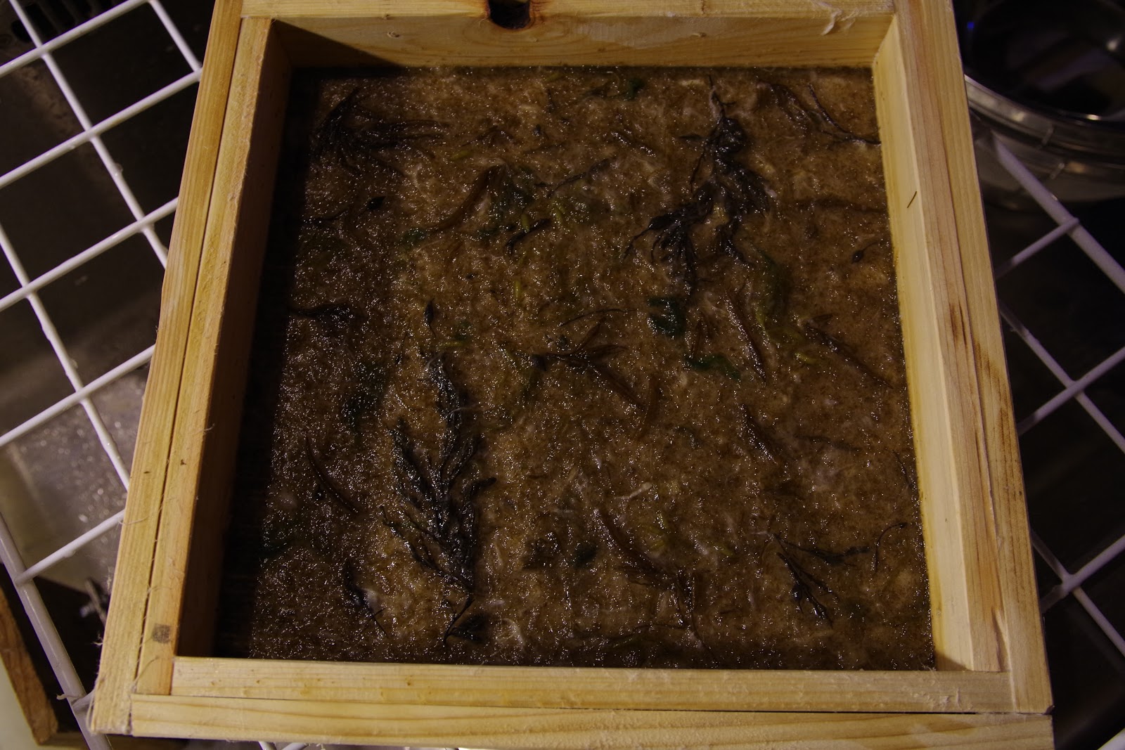 乾燥させた白皮をアルカリ液(灰汁)で煮込む